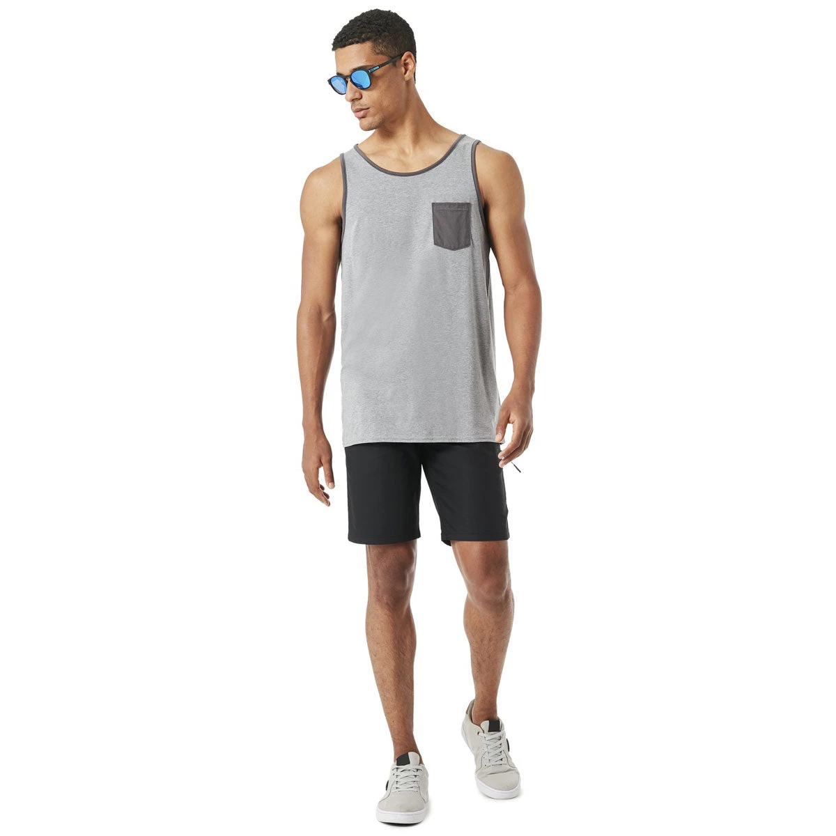 This regular-fit tank top mixes the softness of cotton with the lasting durability of polyester. We added contrast edging to a heathered textile, then highlighted it with a contrast pocket for a smooth, understated look.